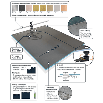 With a 360° rotatable high-flow drain, cut-to-length grating, and EIGHT colour finish options, plus custom colours to match today’s designer brassware, the WetBase One Infinity wet room shower tray is as flexible as it is beautiful.